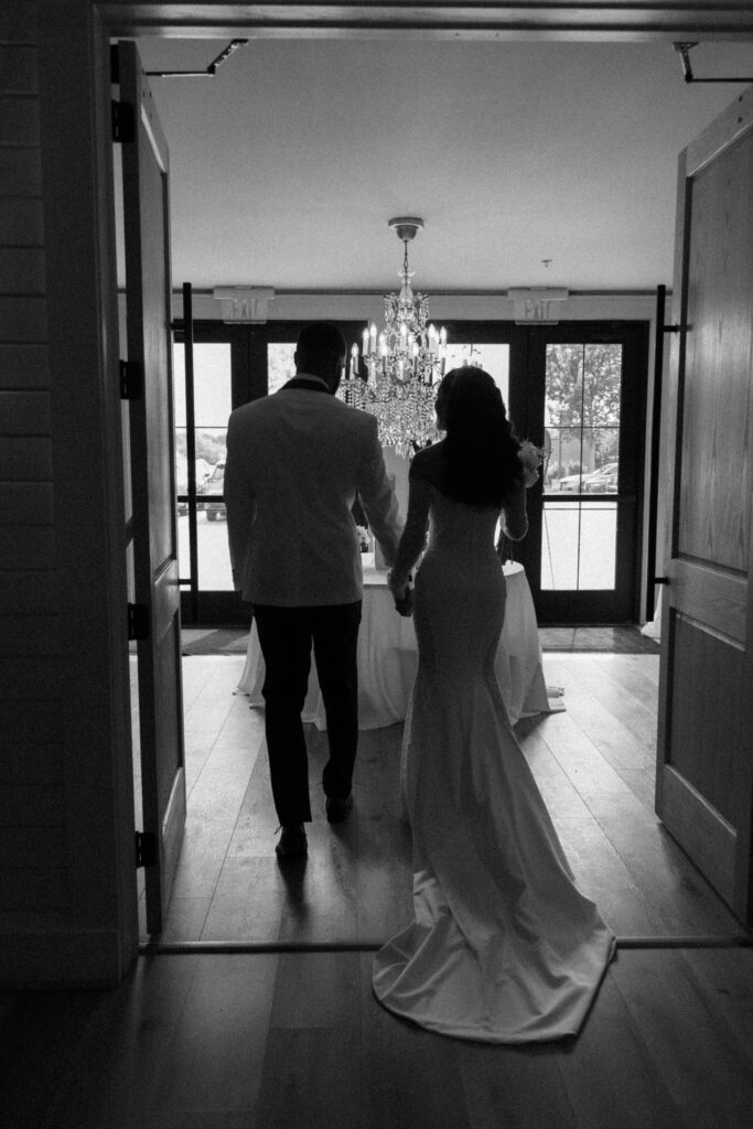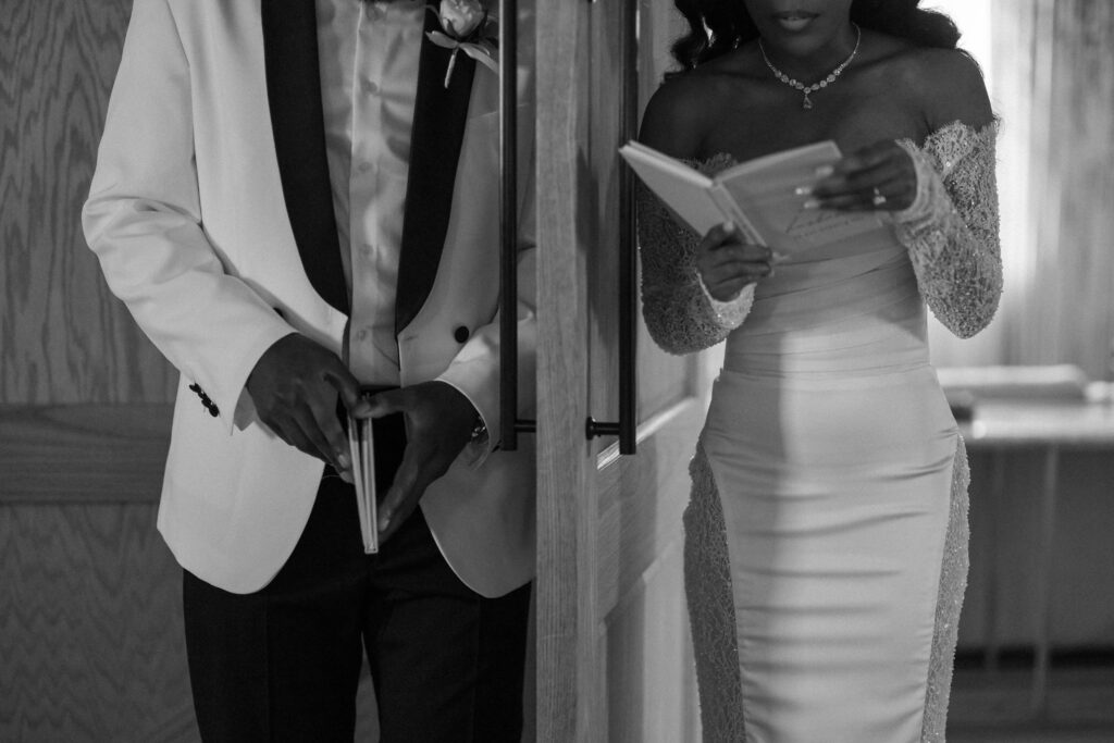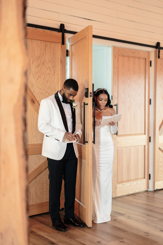 Before the ceremony, the couple shared a private first touch- no first look, just the sound of their voices reading heartfelt vows, hands intertwined around a doorway. It was quiet, emotional, and completely magnetic.